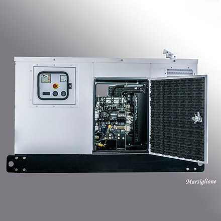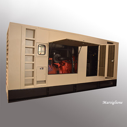 Cabina Acústica construida con chapa plegada del 14; con base trineo para el generador y refuerzos de chapa de 3/16 desfofatizada y pintada con esmalte sintético al horno; a prueba de intemperie con puertas de inspección accesibles para su mantenimiento con llave de fácil desarme con todos los paneles revestidos con material fonoabsorvente del tipo Sonex autoextinguible con retardante de llama Modelo Super Silent caño de escape acústico residencial de 4 etapas y mayor absorción del ruido con doble trampa de sonido.